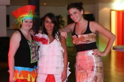 The novelty of the outfits was incredible! However, some students realized engineering flaws when they needed to use the restroom, bend over, or dance. The bar staff provided a stapler and tape to help mend outfits that were 'movement deficient'. This will be a night remembered for a long time!