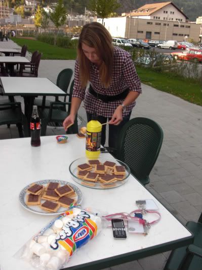 Student gathered around the burning coals to toast their Marshmallows to perfection! Some students were excited for the opportunity to have s'mores in Switzerland... a rare treat, and others were intrigued by the creation.... and later addicted to the chocolaty goodness :)